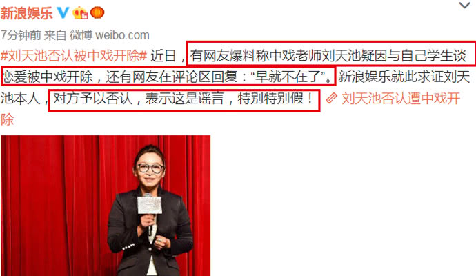 剛剛,媒體得到劉天池本尊的嚴肅回應,稱目前網絡上流傳的“劉天池與學生談戀愛,從而被中戲開除”壹事純屬子虛烏有,劉天池回應稱:“這是謠言,特別特別假……”