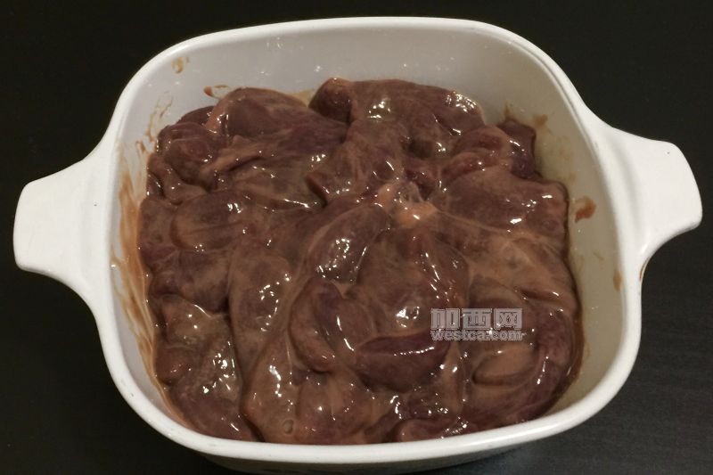 豬肝切薄片,加料酒澱粉醃拾伍分鍾。 注意,不要加鹽,豬肝蛋白質多,鹽會使蛋白質收縮,起凝固作用,放鹽豬肝會特別老。