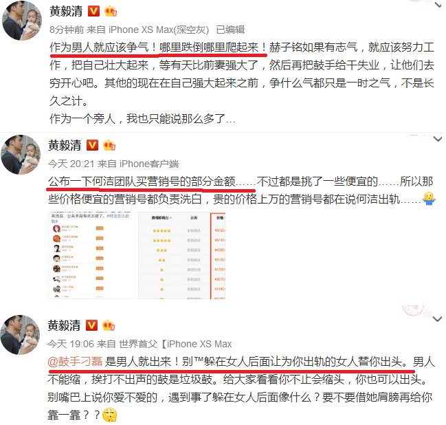 黃毅清似乎越戰越勇,僅僅28號壹天就連發拾數條微博,從暗諷何潔,說到鼓勵赫子銘:是男人就爭氣,再到喊話刁磊:是男人就站出來。還接連爆料暗指何潔團隊“公關”輿論。黃毅清的操作真是讓人眼花繚亂,目不接暇。