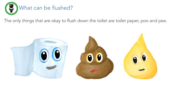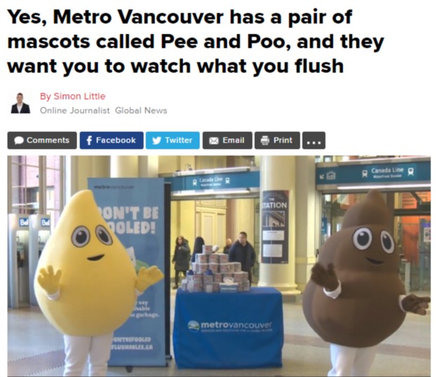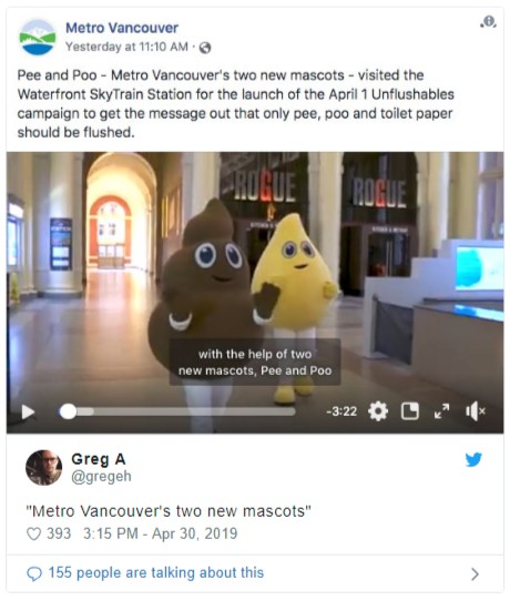 這倆吉祥物近期將分別出現在大溫市政的社交媒體首頁上,提醒人們正確沖廁所。