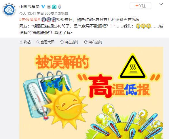 【僑報網訊】每到夏季,總有人質疑,明明已經超過40℃,天氣預報故意壓低溫度不敢報,是在給企業節省高溫津貼?7月1日,中國氣象局通過其微博表示,“高溫低報”是誤解。