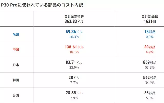依據日媒統計的P30 Pro的零部件成本數據,壹台P30 Pro手機當中,來自美國的零件為15個,總價值為59.36美元,占總價的比例為16.3%;來自中國大陸的零件為80個,總價值為138.61美元,占比為38.1%;來自日本的零件為869個,總價值為83.71美元,占比為23.0%;來自中國台灣地區的零件為83個,總價值為28.85美元,占比為7.9%;來自韓國零件為562個,總價值為28美元,占比為7.7%。