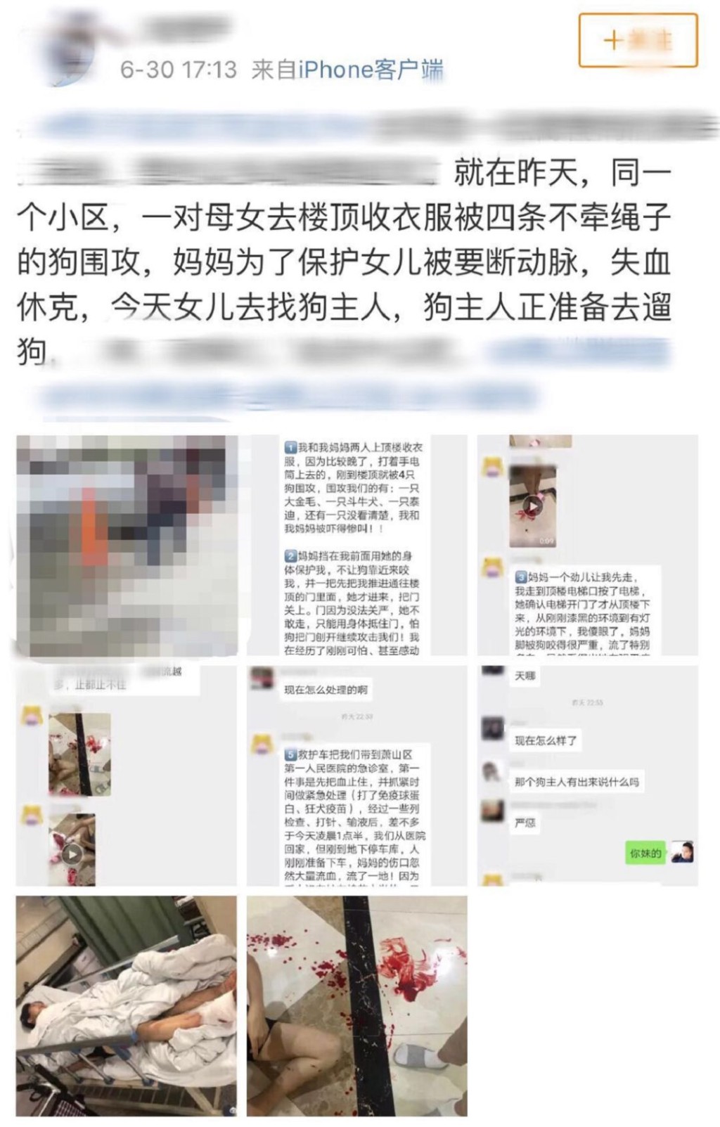 結果壹到頂樓就遭到了4條狗圍攻。她說,當時她的媽媽壹直在她身前護著她,最後把她推出了頂樓的門,還壹個勁叫她先離開。