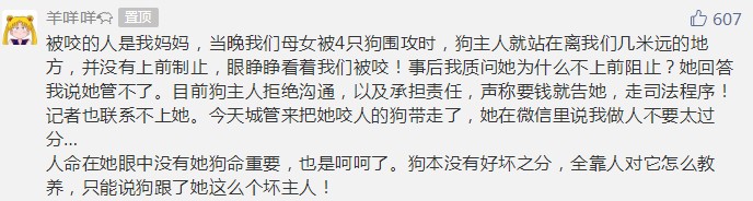 楊女士表示她們被4只狗圍攻時,狗的主人就站在幾米遠的地方,卻沒有上前阻止。