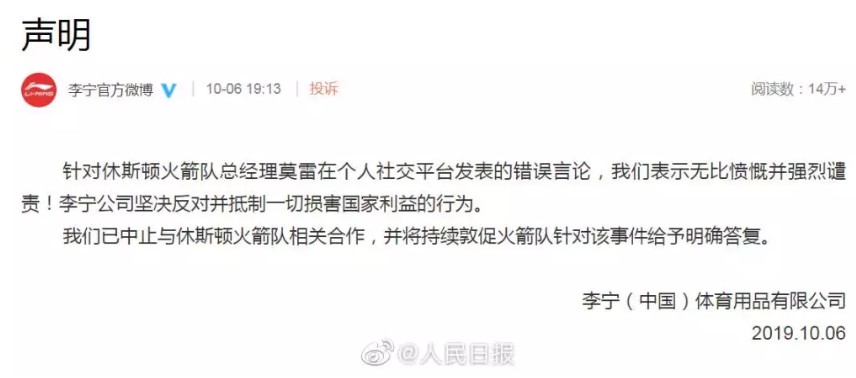 李寧官方微博也發表聲明表示已經終止與休斯頓火箭隊相關合作,並將持續敦促火箭隊針對該事件給予明確答復。