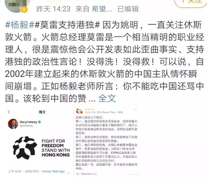 或許是出於輿論壓力、或者是商業考量,莫雷很快刪除了相關內容,火箭隊老板也發聲明稱,莫雷不能代表火箭隊,火箭隊與政治無關。但是這種道歉似乎並沒有什麼真情實意。