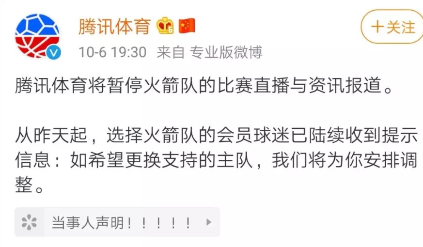 騰訊體育也與休斯頓火箭隊劃清界限,稱騰訊體育將暫停火箭隊的比賽直播與資訊報道。