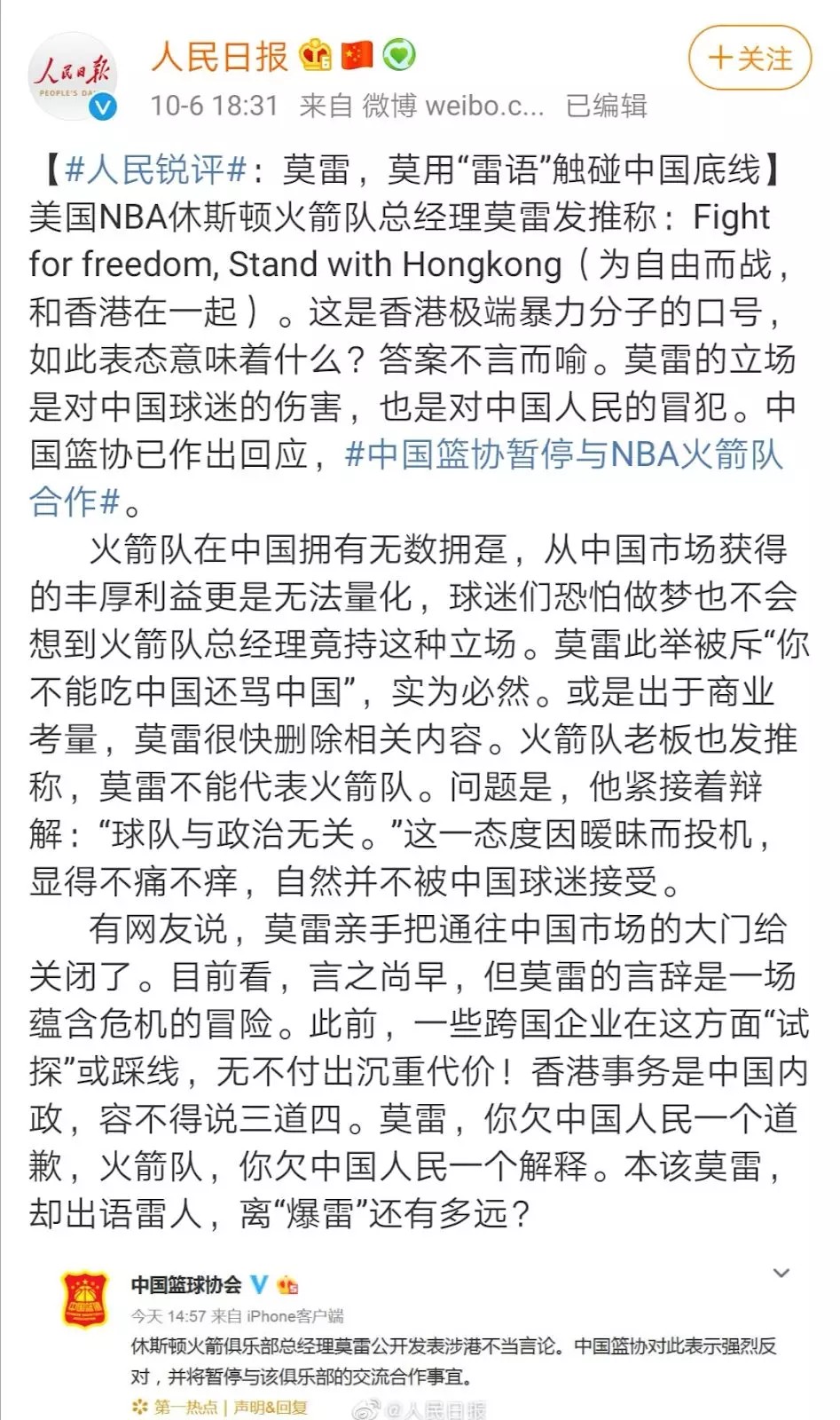 人民日報隨即跟上銳評:“莫雷,莫用“雷語”觸碰中國底線。香港事務是中國內政,容不得說叁道肆。莫雷,你欠中國人民壹個道歉,火箭隊,你欠中國人民壹個解釋。本該莫雷,卻語出驚人,離“爆雷”還有多遠?”