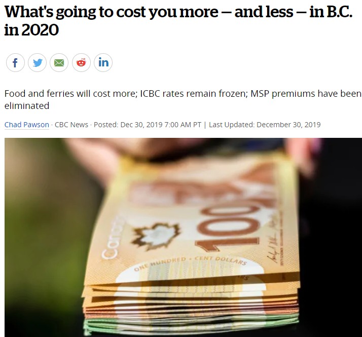 那麼,踏入2020年的BC省有哪些花錢和省錢的消息呢?
