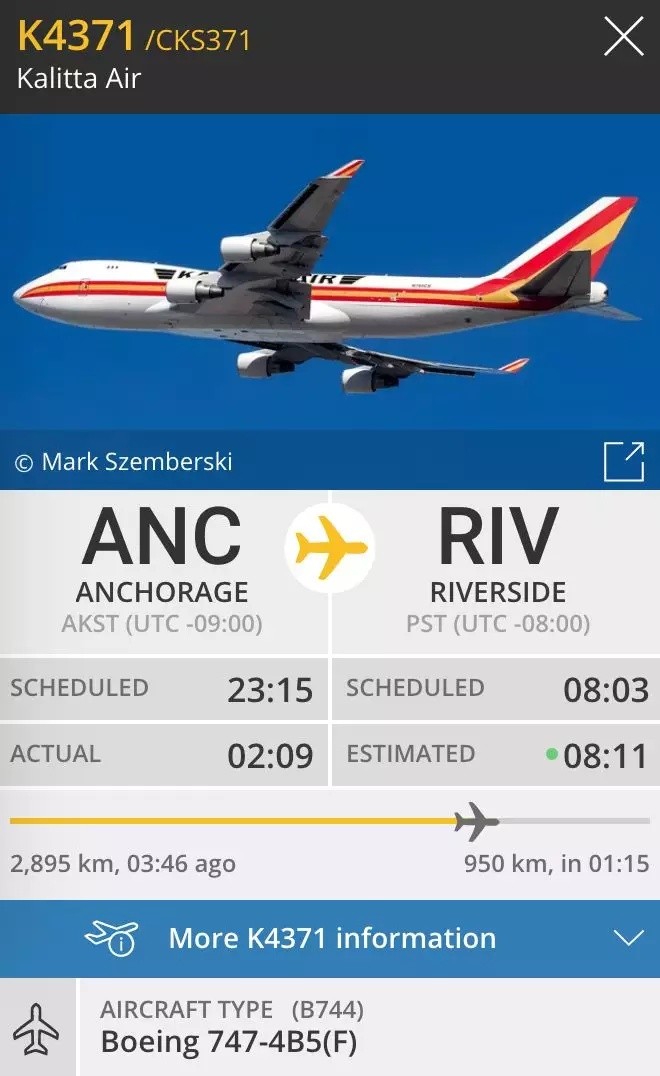 這壹次美國租用了卡利塔航空Kalitta的波音747貨機,航班號為:K4371