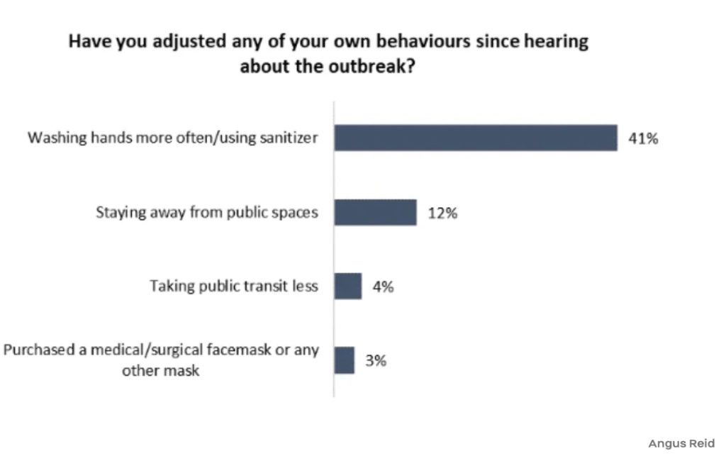 数据还显示,有12%的加拿大人表示,他们比平时更多地躲避公共场所,只有4%的人说,这种病毒降低了他们对公共交通的使用。