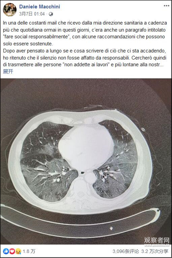 Macchini自述已在北部城市貝加莫的醫院裡長期值守,那是全國疫情最嚴重的地區之壹。
