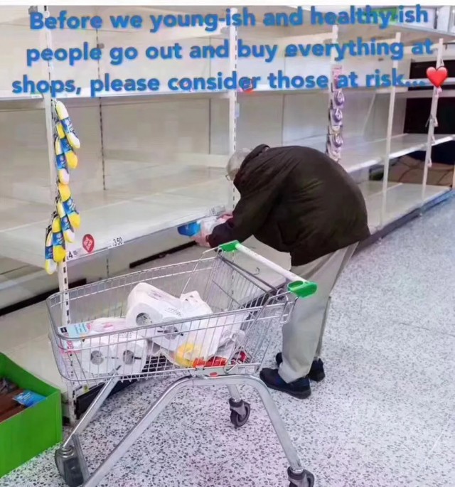 众所周知,此次新冠病毒肆虐,老年人是最易感染病毒,最容易发展为重症的人群。如今却为了购买生活日用品,无奈进入人群。然而好不容易排队进入超市后,却只能对着被抢购一空的货架发呆,无助。