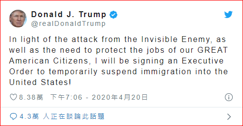 總統川普20日晚間在推特宣布,將簽署最新行政命令,暫停接受來自全球各地對美國的移民申請作業。
