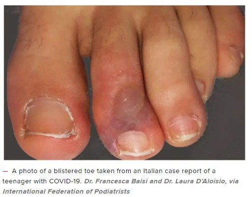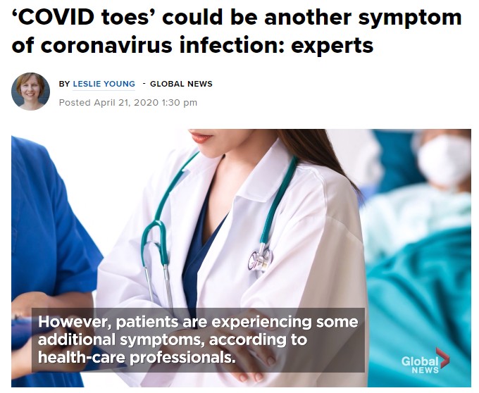 (加西網綜合)據Global News報道,世界各地皮膚病學家們開始報告壹些與新冠病毒COVID-19有關的特殊症狀 : 皮膚變色和 ( 或 ) 起疹子,通常出現在人的腳趾和手指上。根據加拿大皮膚病學協會(Canadian Dermatology Association)主席Kerri Purdy醫生的說法,稱這種現象為“新冠腳趾(COVID Toes)”或“ 新冠手(COVID hands)”。