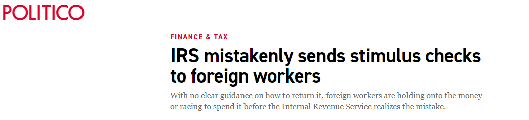 (“政客”網站:國稅局錯誤地將刺激支票發給了外國工人)