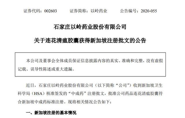 今日(5月7日),以嶺藥業發布公告稱,公司收到新加坡衛生科學局(HSA)核准簽發的“中成藥”注冊批文,批准連花清瘟膠囊符合新加坡中成藥標准注冊,這也意味這著連花清瘟具備了在新加坡市場以藥品身份銷售的資格,以嶺藥業方面稱,這將給公司拓展海外市場帶來積極影響。