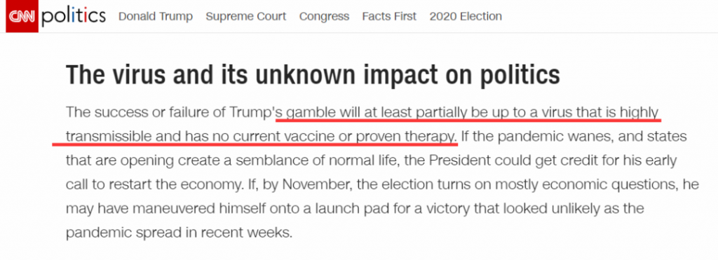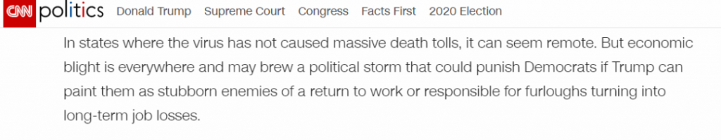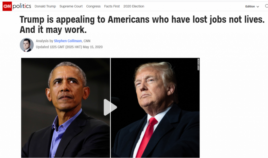 “特朗普在取悅那些失去工作的美國人,而不是那些失去生命的”,CNN在其報道的標題中就開門見山地寫道,“而這個策略可能還真會起作用”。