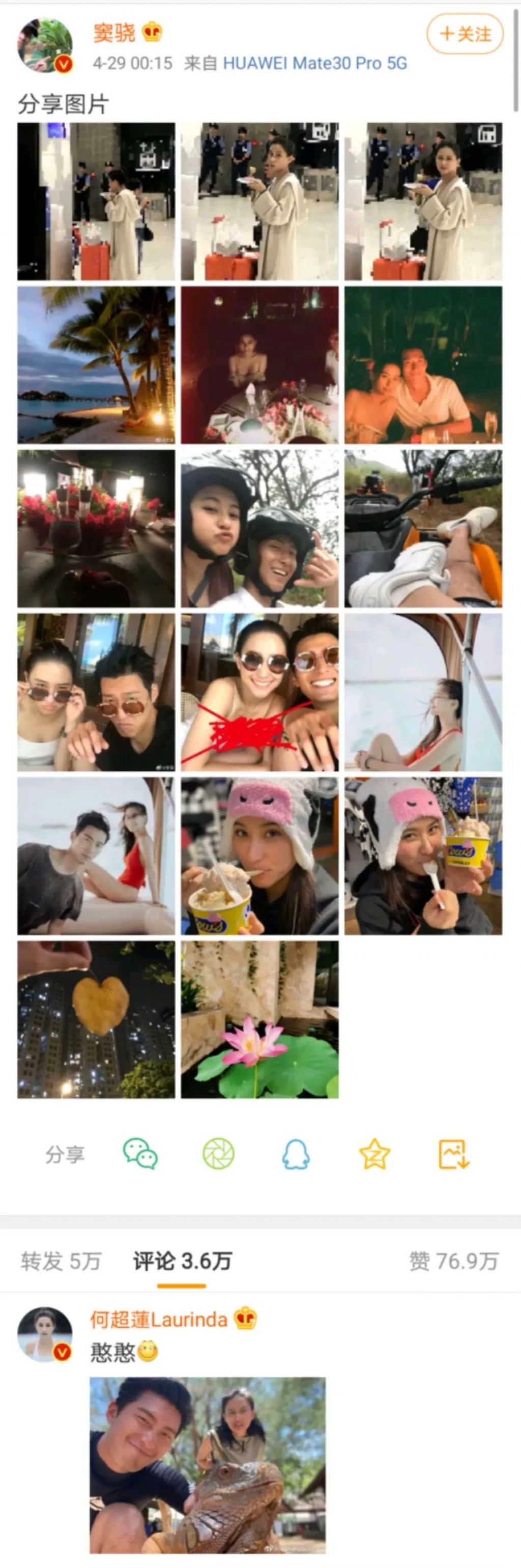 4月29日,窦骁在微博晒出一组与女友何超莲的日常照。何超莲是赌王何鸿燊和三太陈婉珍的女儿,英文名Lourinda。