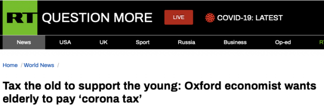 ?《今日俄羅斯》:向老年人征稅以支持年輕人:牛津大學經濟學家希望老年人繳納“新冠病毒稅”