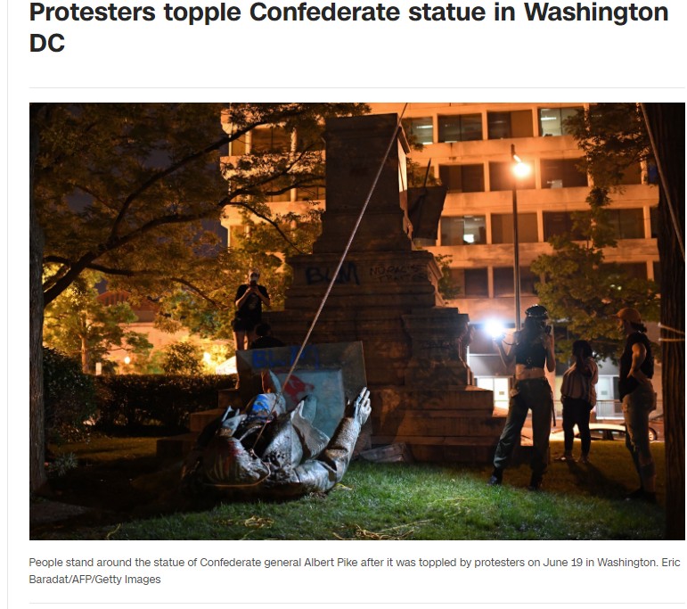 据美国有线电视新闻网(CNN)的报道,昨天星期五,华盛顿特区的抗议者推翻了邦联将军阿尔伯特·派克(Albert Pike)的雕像。