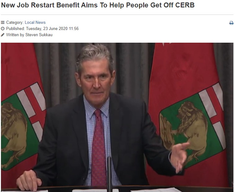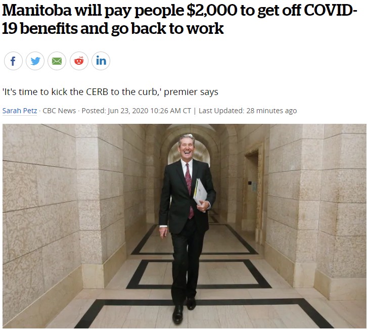 曼省省長 Brian Pallister 霸氣表態,是時候把聯邦這CERB政策踢開了!