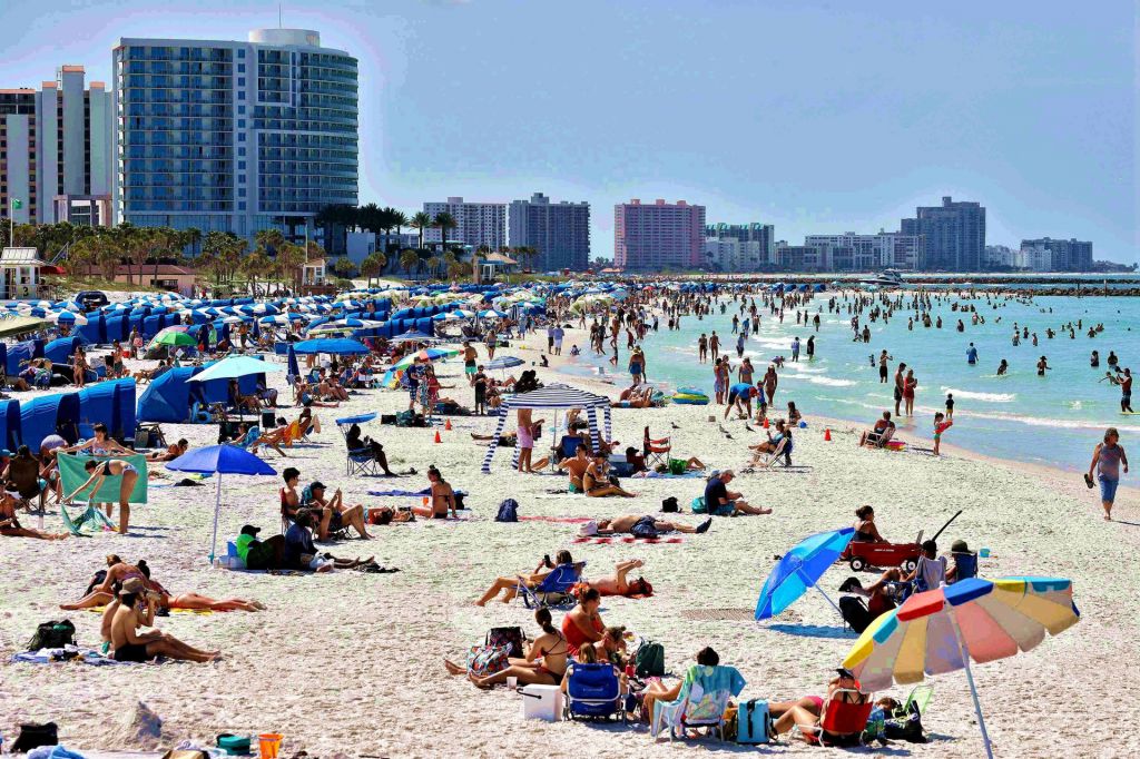 2020年3月18日,疫情爆發之初,盡管政府不斷警告和提醒,游客們還是集聚在佛羅裡達州的清水海灘(Clearwater Beach)盡情享受。(AP)