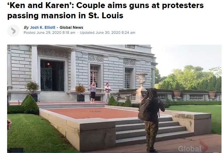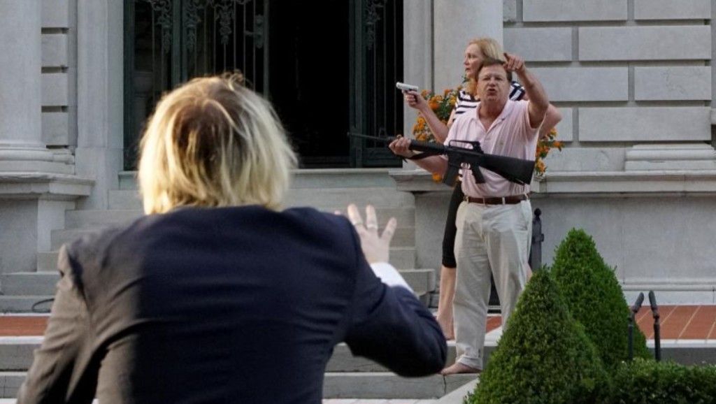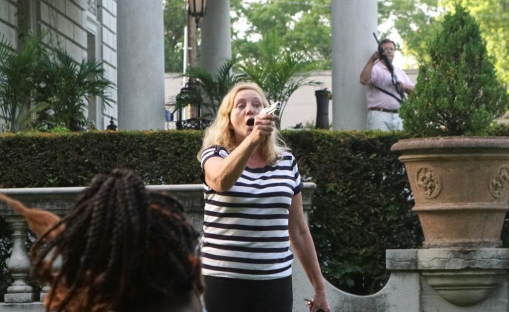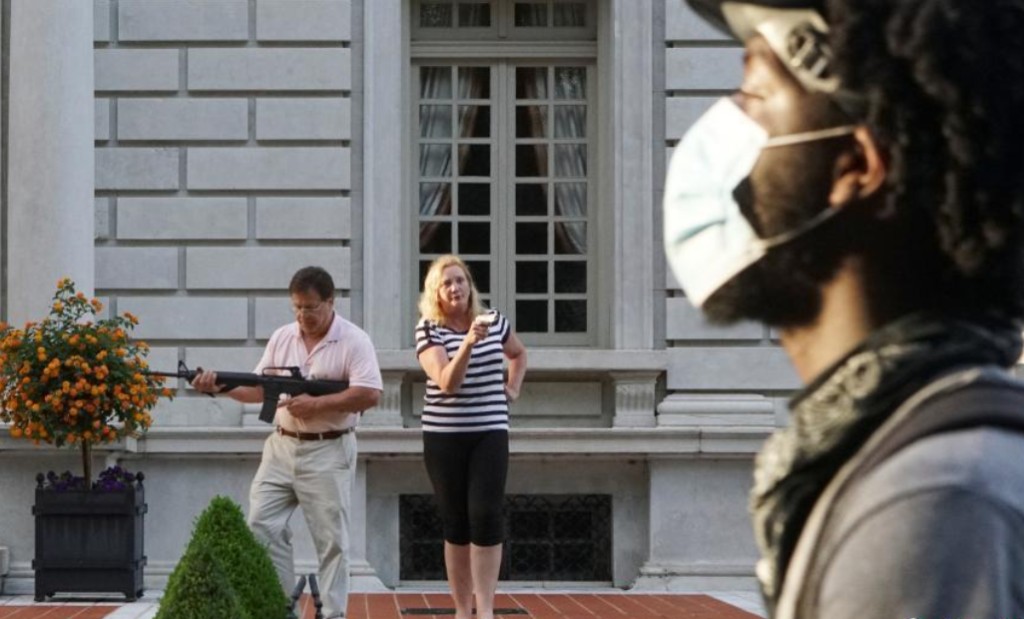 壹對白人夫婦被拍到用槍支,指著那些聚集在他們住處附近的抗議者。