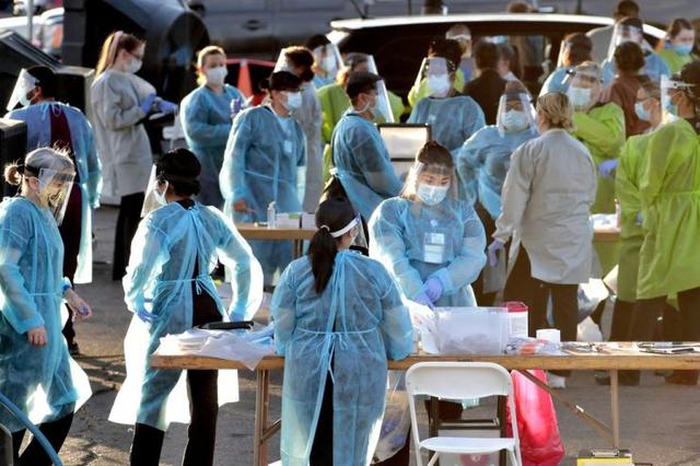 上周六(27日),亞利桑那州鳳凰城的壹處監測點,醫護人員正在為人們免費檢測新冠病毒。(圖片來源:美聯社)