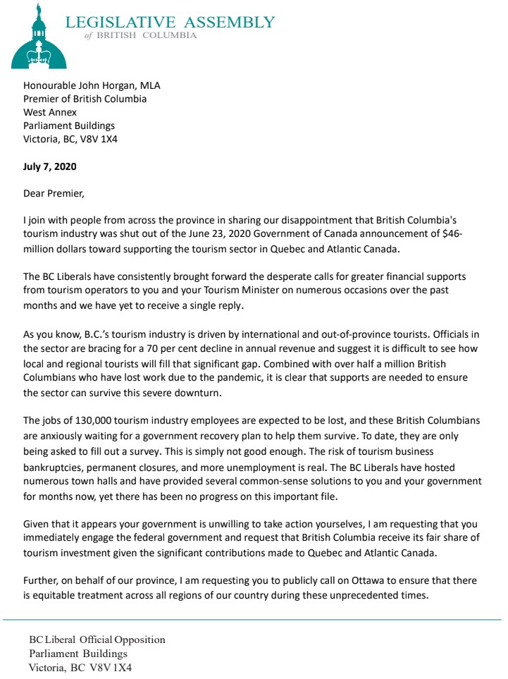 自叁月疫情開始以來,卑詩自由黨聽取了旅游業迫切的求助呼聲,舉辦了聚焦旅游業的網絡會議,並要求卑詩旅游廳長Lisa Beare作出旅游業經濟復蘇計劃。此外,卑詩自由黨過去幾個月 來給廳長寫的多封信,仍無得到任何回復。