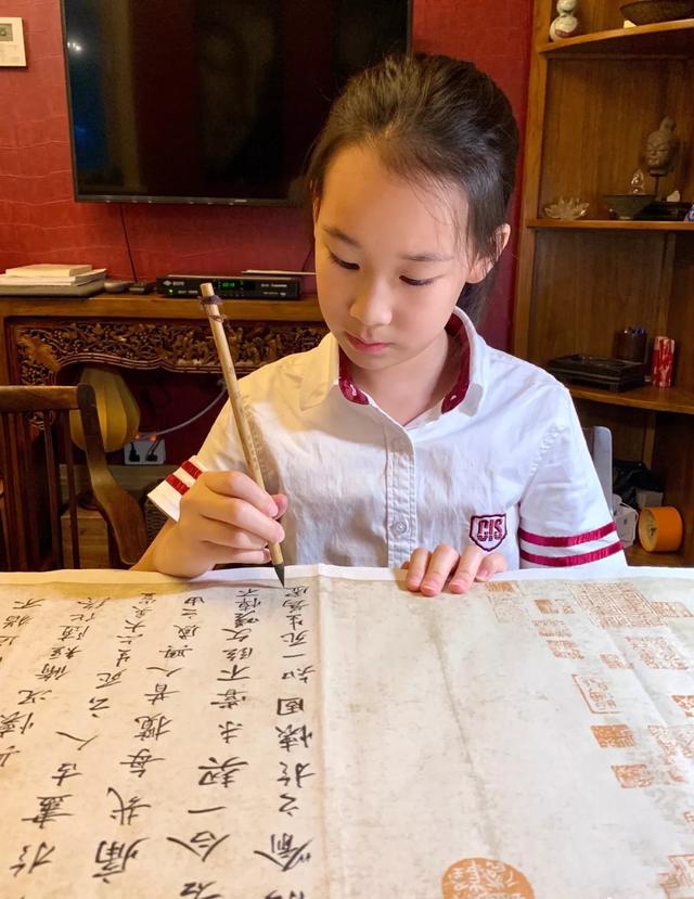 赵文卓的女儿名叫赵子仪,从图片中可以看出,她学习书法已经有很长一段时间了,书法写得有模有样,用笔扎实,字形和谐,一笔一划都很讲究。她的字和她的长相一样,沉静甜美。对于一个十岁左右的孩子,能写成这样,已经相当出色了。