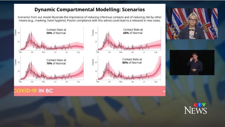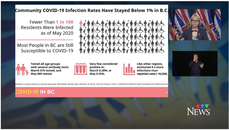 從流行病學的模型來看,5月以來BC省居民接觸到新冠病毒的比例低於1%,但同時Henry博士提醒所有人,如果無法控制好接觸社交圈、無法做好社交距離等,BC的疫情可能隨時會反彈。