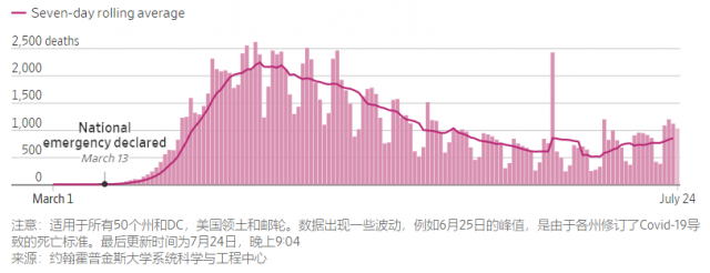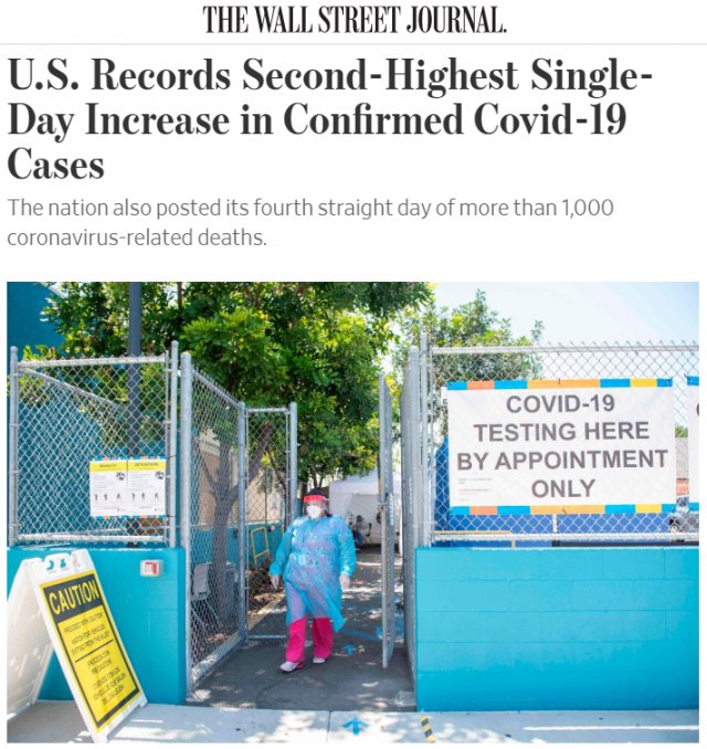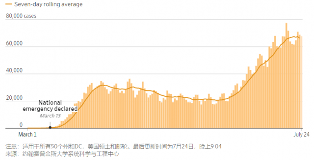 據華爾街日報報道 美國在周伍(7月25日)新增冠狀病毒感染病例73700例,創單日第贰高增幅。