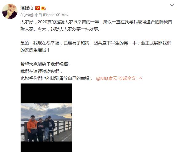 新京报快讯 7月27日,知名歌星潘玮柏微博发文宣布结婚:“我现在很幸福,已经有了和我一起共度下半生的另一半,并正式开展我们的家庭生活啦!”