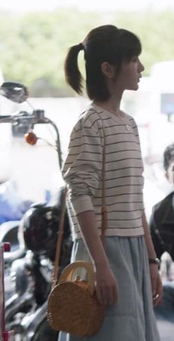 這套很清新很日系,條紋的休閒衛衣看起來元氣滿滿,搭配淺藍色牛仔A字半身裙,腳踩小白鞋,土黃色編藤斜挎包為整體壹身藍白增添了壹抹亮點,這壹身既舒服又減齡的搭配,很適合日常穿著。