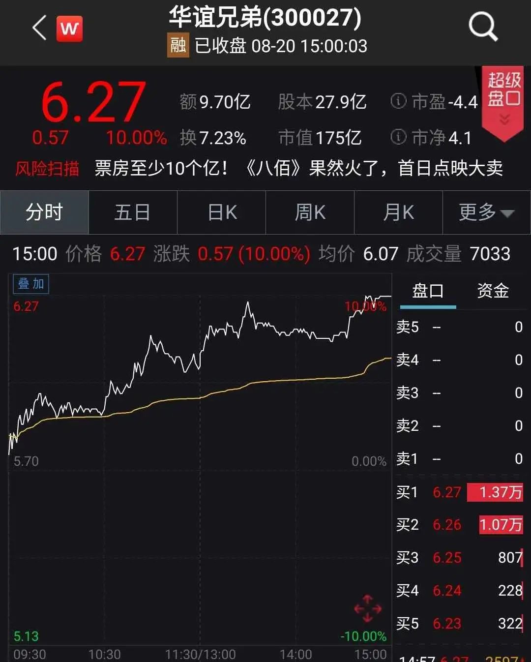 受益於電影被看好,8月20日,《八佰》出品方華誼兄弟股票尾盤漲停,報收於6.27元/股。
