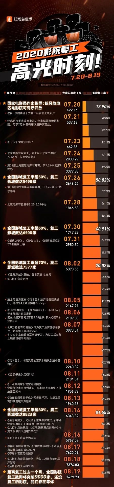 作為上座率限制放寬後的首部大片,《八佰》的票房表現成為市場焦點。該片8月14日在全國部分影院點映,8月21日起進行全國公映。