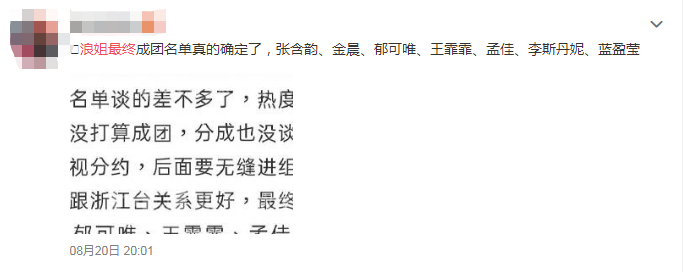 最後的成團名單由原本的伍人團,後改為柒人團,分別是:張含韻、金晨、郁可唯、王霏霏、孟佳、李斯丹妮、藍盈瑩。
