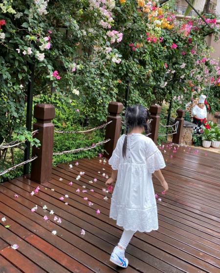 壹個白色的裙子扎著兩個麻花辮搭配連體褲襪和壹雙白色的運動鞋,餃子的背影就好像迪士尼的小公主壹樣。