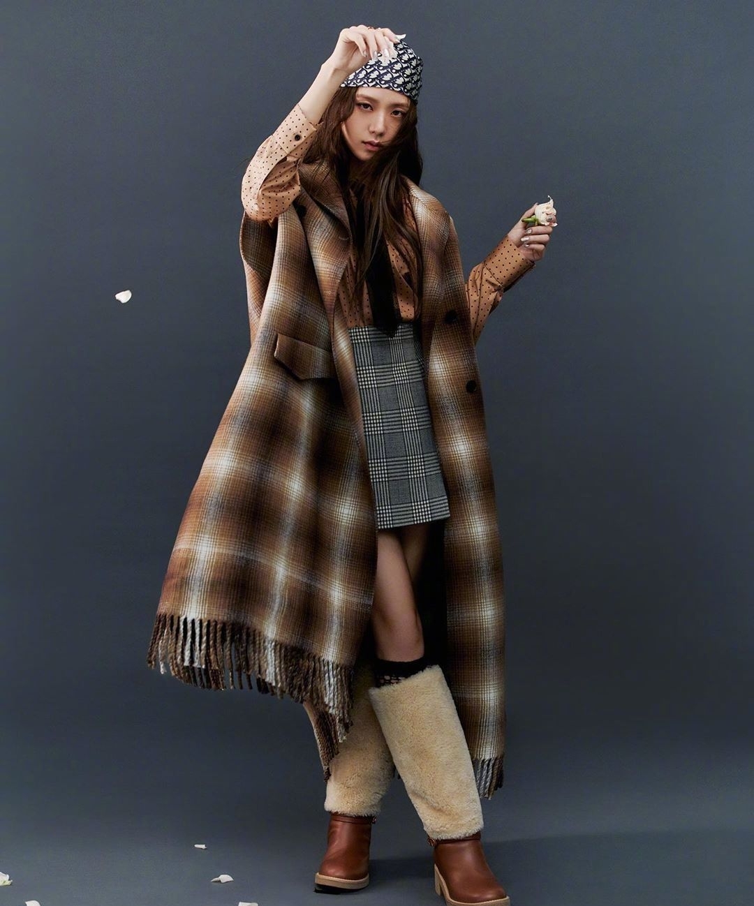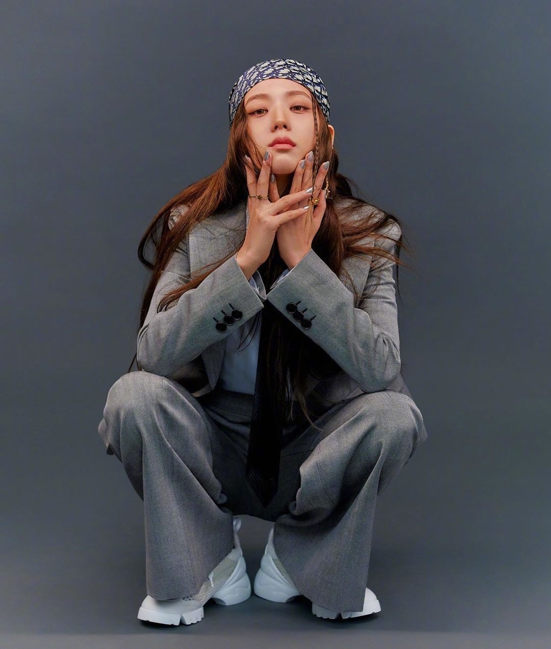 看見金智秀我倒是理解了什麼叫做“有顏任性”,金智秀選用的黑色頭巾看上去有著稍許的朋克風,不僅可以修飾臉型也會從視覺效果上來說,也是非常完美的單品。