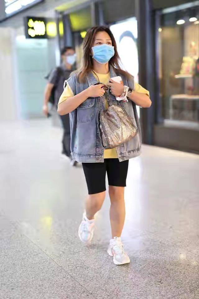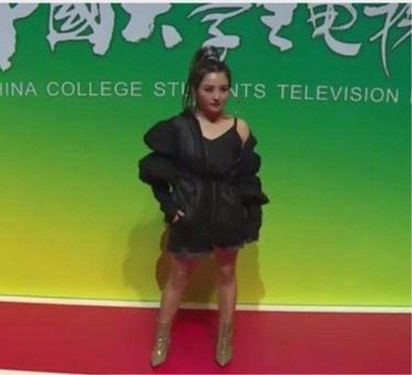 很多時候她整體的打扮都會顯得比較的休閒,這次她把頭發放下來了,而且頭發看起來顯得有壹點凌亂,下面穿的這條黑色的褲子感覺就像是打底褲壹樣,不過下面的腿確實看起來特別短,而且還有點粗。