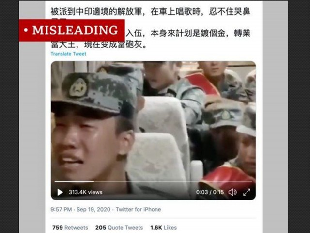 英國廣播公司辟謠,解放軍痛哭和中印邊境毫無關聯,是誤傳和誤導。(BBC新聞網截圖)