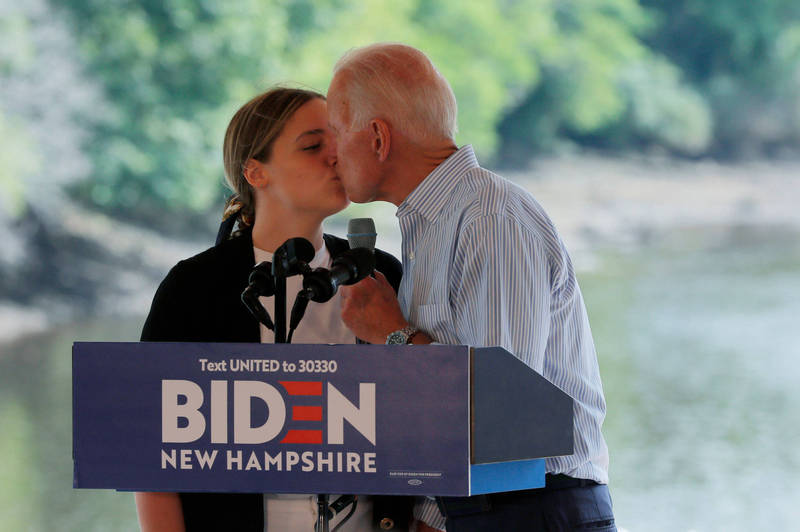 拜登(右)在競選活動中,公開親吻孫女的畫面被挖出,引發網友怒轟。(路透檔案照)