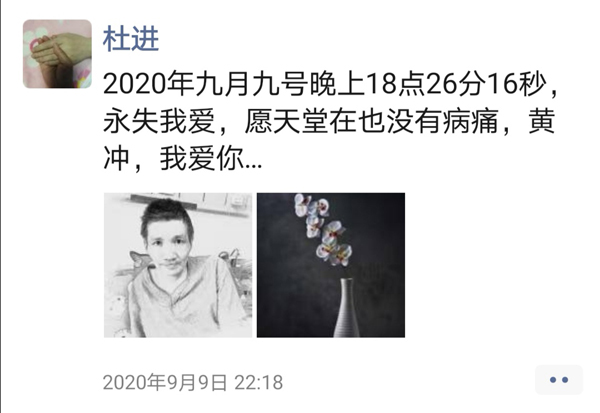 “可惜沒有等到。”9月9日,黃沖去世。杜進在朋友圈寫:“2020年九月九號晚上18點26分16秒,永失我愛,願天堂再也沒有病痛,黃沖,我愛你。”