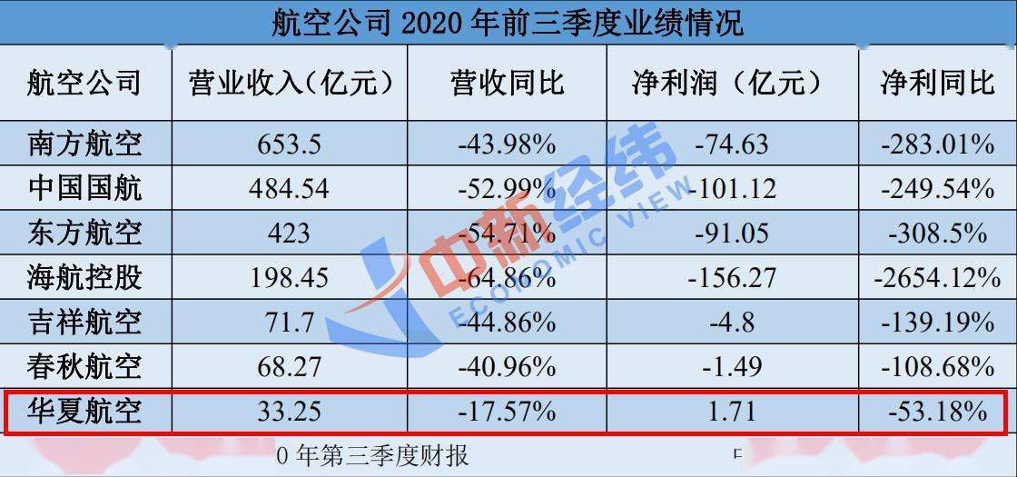 近日,南航、国航、东航、海航、吉祥、春秋、华夏航空相继发布的2020年第三季度报吿显示,前6家前三季度营收近乎腰斩,净利润同比也出现三位数下滑。其中,海航控股前三季度净利润亏损156.27亿元,同比减少2654.12%。而华夏航空实现净利润1.71亿元,成为唯一实现盈利的航司。