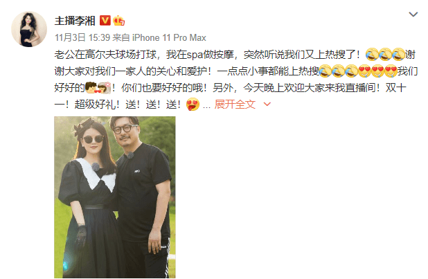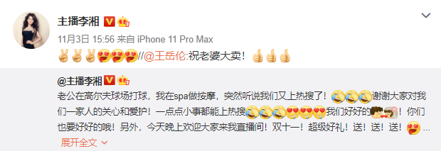 隨後王岳倫也火速轉了這條辟謠,並祝老婆直播間大賣,李湘也用表情回復了老公。