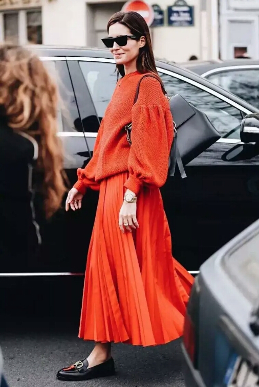 造型上不妨選用同色系,瞬間提升高級感,延長身材線條。這款橘色半身裙,大幅度選用條紋圖案,有種公主裙視覺感,很有古典氣息。毛衣選用寬松版型,下半身延續這個風格,不會覺得突兀。適合出現在不同場合,彰顯著壹種自信氣場,輕松演繹出都市女性魅力。年輕女孩子不妨嘗試鮮艷顏色,有壹種活潑感,在人群當中顯得很矚目。