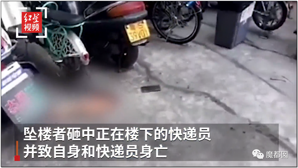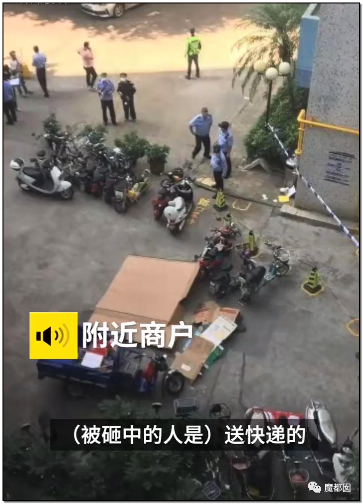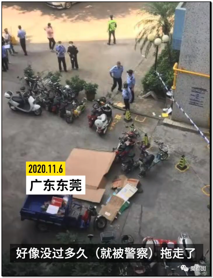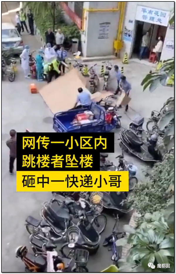 先看快遞員的事情,11月6日13時許,廣東東莞市石龍鎮某花園小區內,壹名男子從小區30樓跳下,砸中小區內送快遞男子。這是當時的情景: