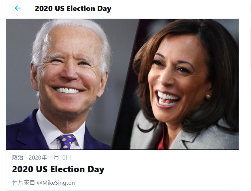 美國民主黨候選人拜登宣布勝選總統,但特朗普仍尚未正式承認連任失敗,他稍早更在推特高呼"我贏了選舉!(I WON THE ELECTION!)"。 I WON THE ELECTION!