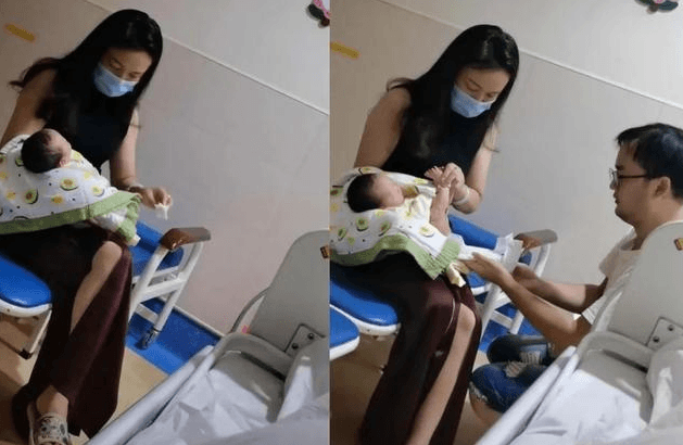 孩子的爸爸在自己岳母的身邊小心翼翼的學著照顧寶寶的技巧,估計新手爸媽在育兒經驗上都拾分的欠缺,畢竟岳母是過來人,將照顧寶寶的經驗傳授給寶爸。
